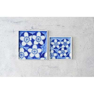 有田焼 伯父山窯 染付桜紋 18cm角皿と14cm角皿の2枚セット (有田焼 八右衛門窯 大慶)