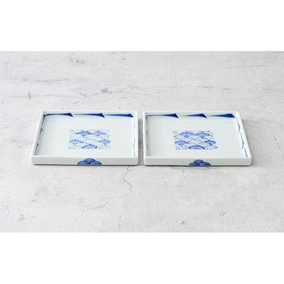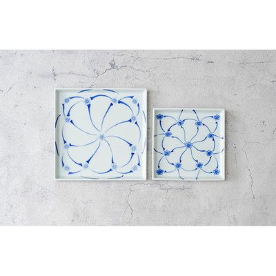 有田焼 伯父山窯 染付ひねり梅小紋 18cm角皿と14cm角皿の2枚セット (有田焼 八右衛門窯 大慶)
