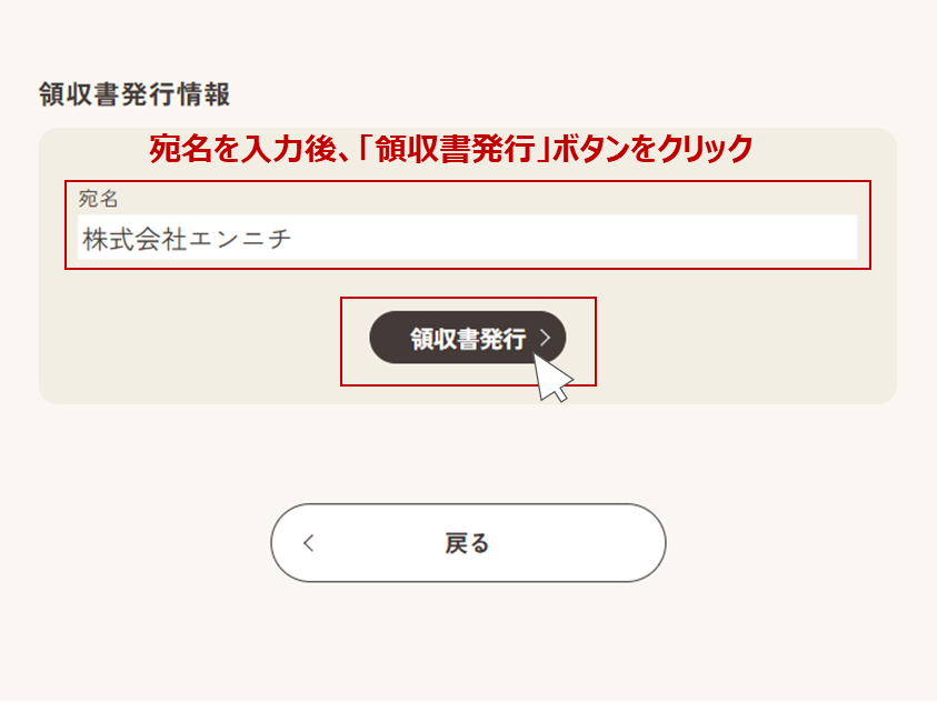注文情報の下部に、「領収書発行情報」が表示されます。「宛名」をご記入の上、「領収書発行」をクリックしてください。