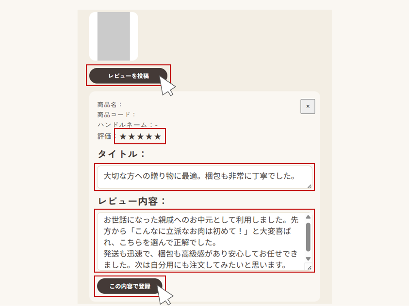 ※ハンドルネーム(レビュー投稿者として商品ページに表示されるユーザー名)は、会員情報編集より設定を行ってください。設定せずに投稿を行った場合は、ハンドルネームは「ー」と表示されます。