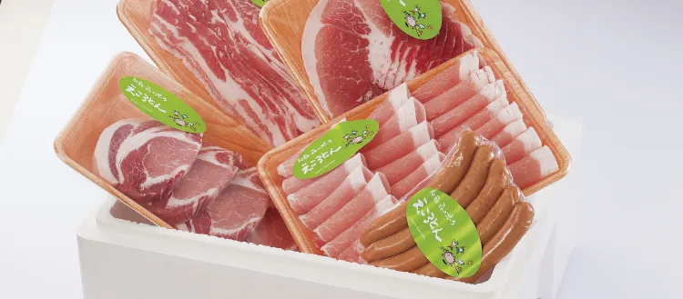 | 内容量 | 豚ロースカツ4枚(350g)、豚肩ロースしゃぶしゃぶ(200g)、豚バラスライス(200g)、豚モモスライス(250g)、ポークウインナーウインナー5本(125g) |