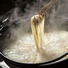 五島流の食べ方「地獄炊き」は、グツグツと煮えたぎる鍋の中からうどんをすくい上げ、薬味を加えた焼きあご(トビウオ)のだしにつけるか、生卵にからめてすすります。
