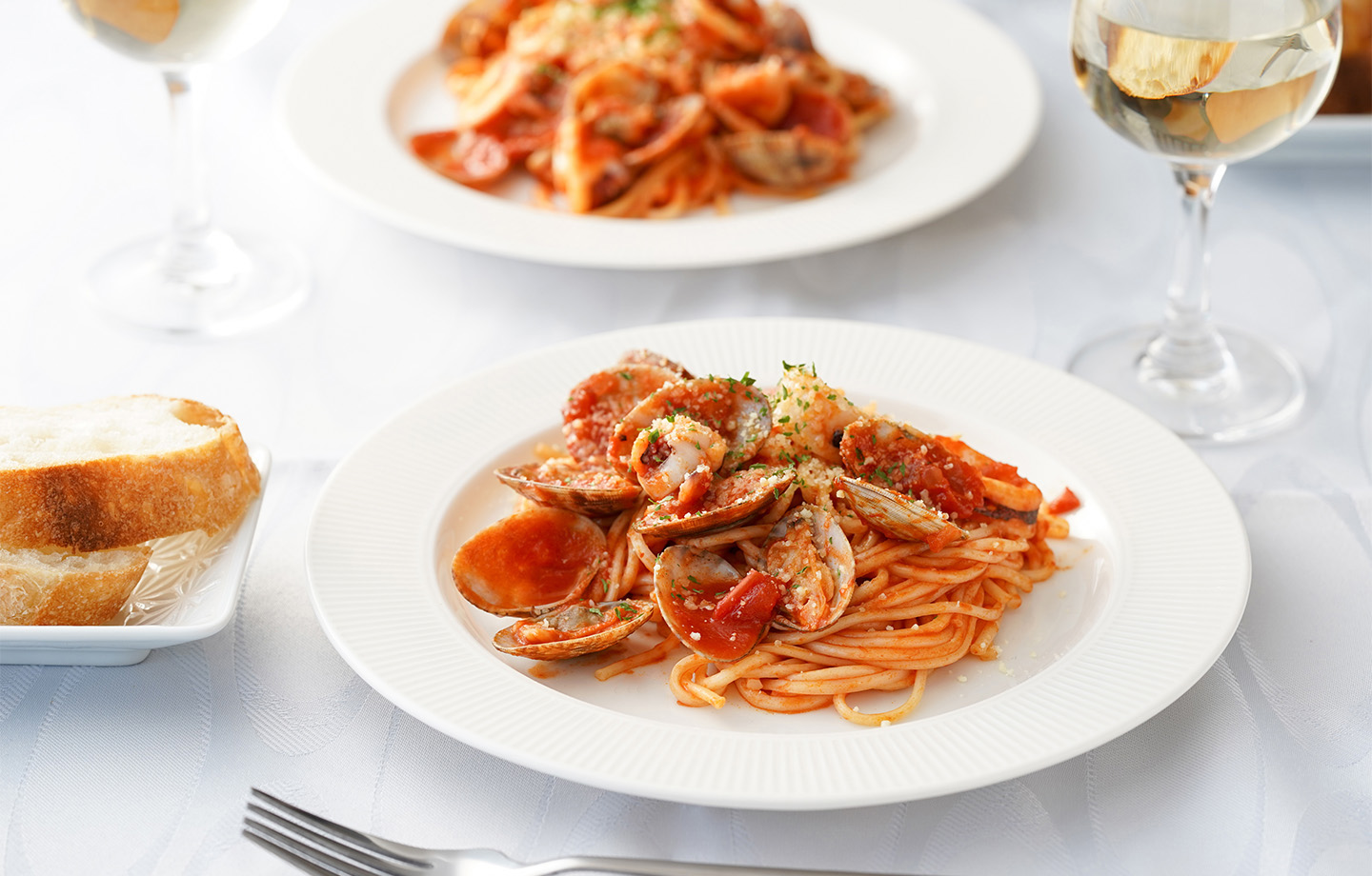 五島手延べうどん 160g、あさり 100g、ヤリイカ 2杯、赤ワイン 大さじ2、にんにく 1片、アンチョビ 4~5枚、バター 大さじ2、ブラックオリーブ 5個、オリーブオイル 大さじ2、塩こしょう 各少々、鷹の爪 2本、粉チーズ(お好みで) 適宜