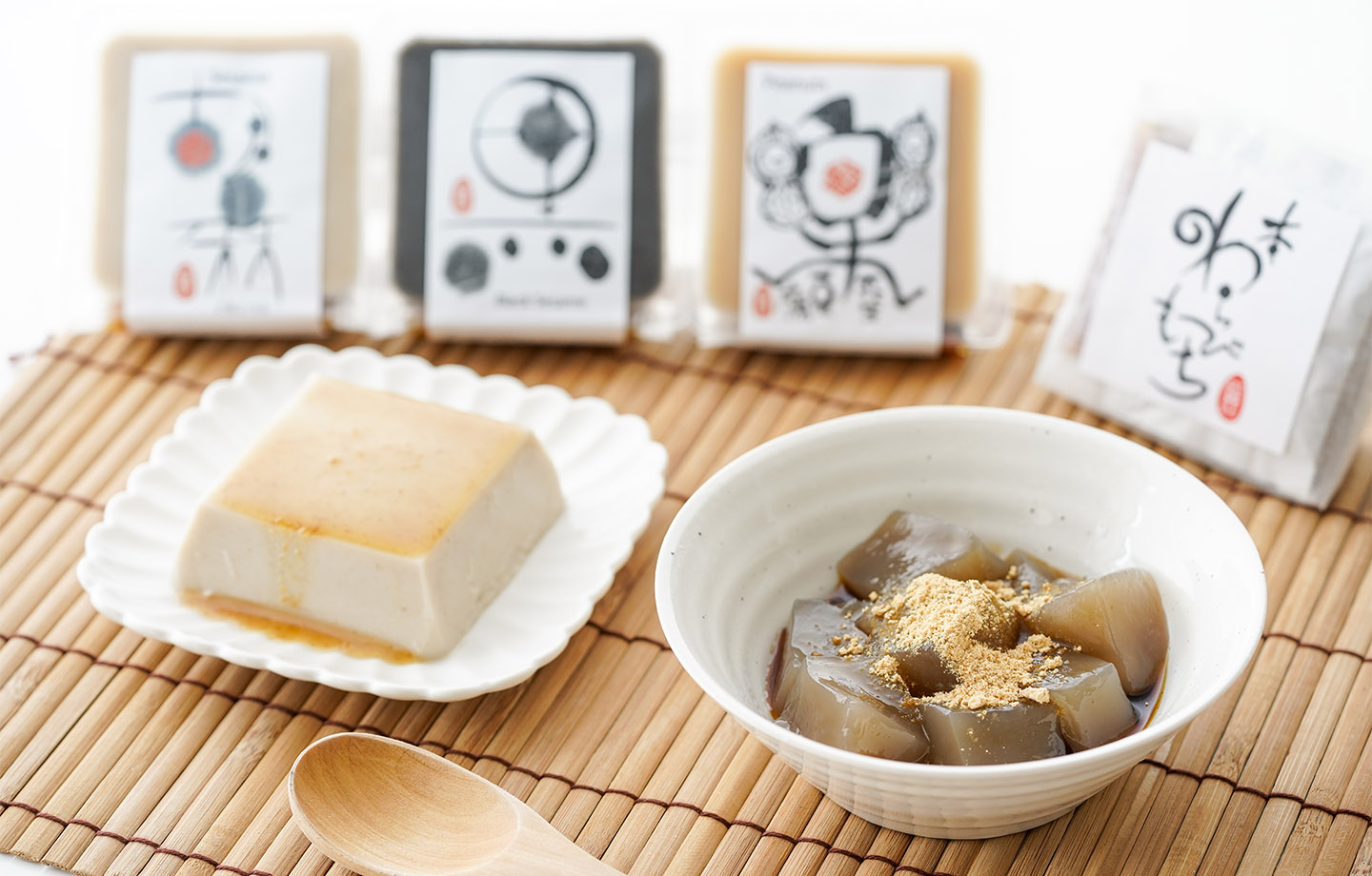 胡麻とうふ・黒胡麻とうふ・落花生とうふは本くず粉100%使用した滑らかな食感が特徴の本格派胡麻とうふで、当店オリジナルのたれ付。