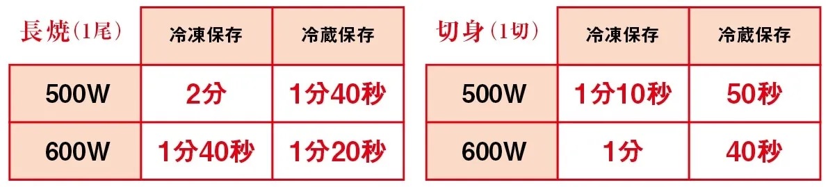 ラップはせず、下記の時間を目安に電子レンジで温めてください。