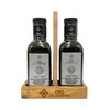 250mlサイズの2つのテイスト(「アルベキーナ」と「ピクアル」)と、オリーブの老木で作られた専用のトレーが一緒になったセットです。