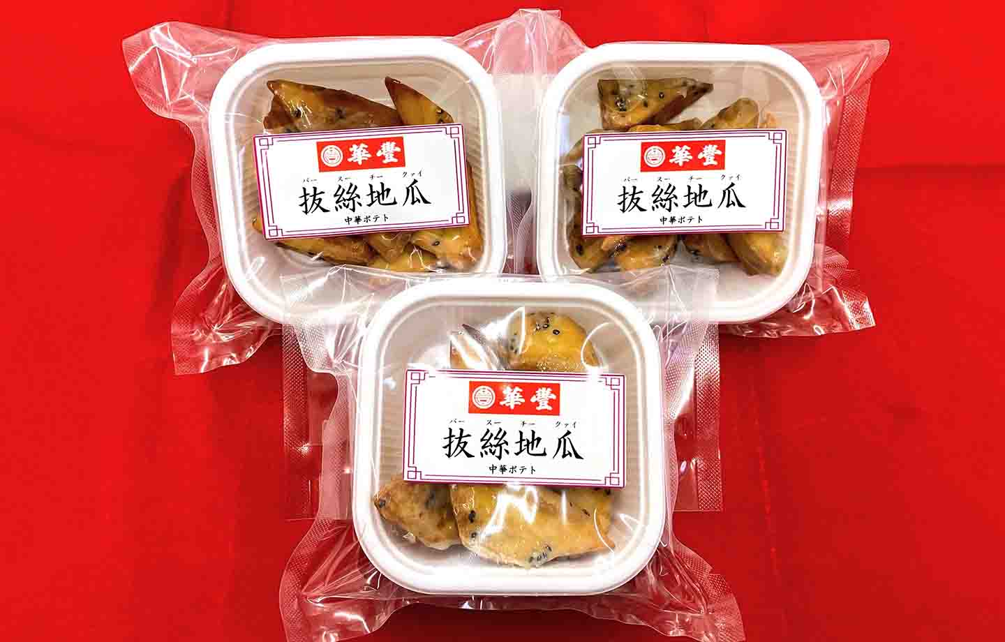 華豊定番デザート。「大学イモ」ではない「中華ポテト」。お店ではできたてアツアツをお召し上がりいただいておりますが、こちらの商品は冷たいデザートとしてお召し上がりください。