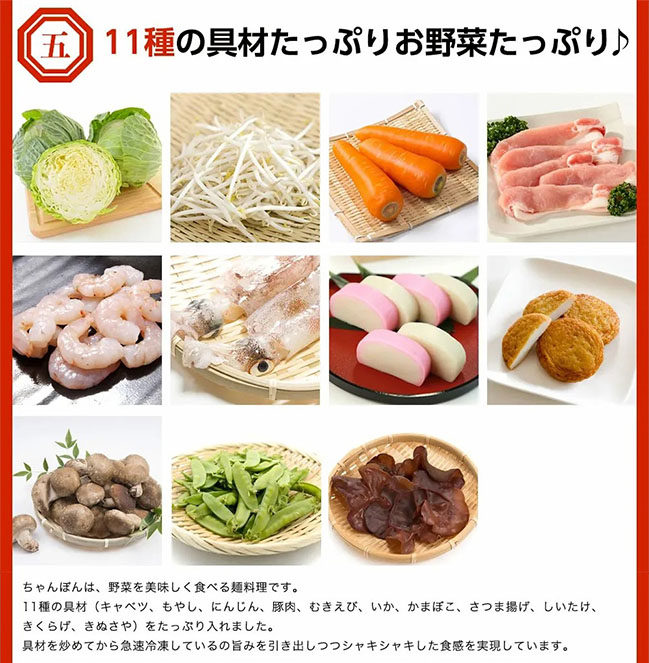 本場の長崎ちゃんぽんが、お鍋一つで簡単に調理ができます。具材には11種類の豊富な野菜・肉・海鮮を使用し、シャキッとした食感に仕上げています。麺は太くてコシ、旨みがあります。まろやかでコクのある豚骨スープを使用して、具材と麺を煮込むほどに旨みとコクが引き立ちます。