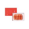 | 原材料 | 原材料:すけとうだらの卵巣(米国またはロシア)、食塩、焼酎、発酵調味料、たん白加水分解物、唐辛子、かつお魚醤、かつお節エキス、還元麦芽糖、いわし魚醤、/甘味料(ソルビット)、調味料(アミノ酸等)、酸化防止剤(V.C)、酵素、着色料(赤102、黄5、赤3)、発色剤(亜硝酸Na)、(原材料の一部に大豆、ゼラチンを含む。) アレルゲン:原材料の一部に大豆、ゼラチンを含む。 |