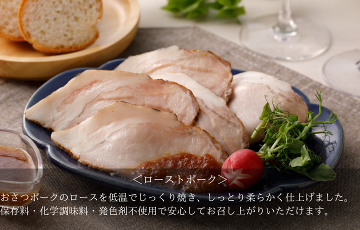おさつポークのロースを低温でじっくり焼き、しっとり柔らかく仕上げました。発色剤・化学調味料・保存料不使用。特製ジャポネソースとローストポークの相性は抜群です。ジャポネソースは、ハンバーグやサラダなどにも活用できます。