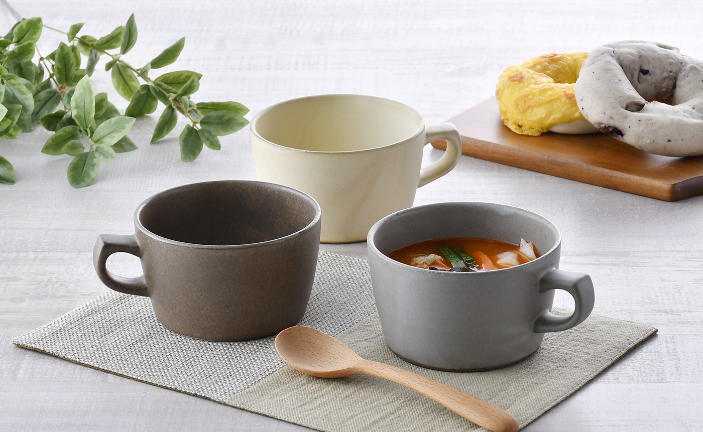 窯元独自に調合された釉薬により、あたたかみのある風合い、上品な雰囲気に作り出されたスープマグ。