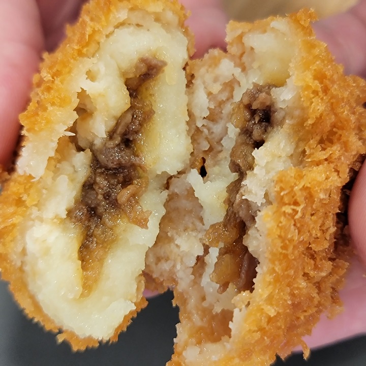 希少な黒毛和牛「筑穂牛」をコロッケの中に閉じ込めました。食べるとコロッケの中に甘辛く仕上げた筑穂牛が入っているのが分かり、ホクホクで美味しいです。