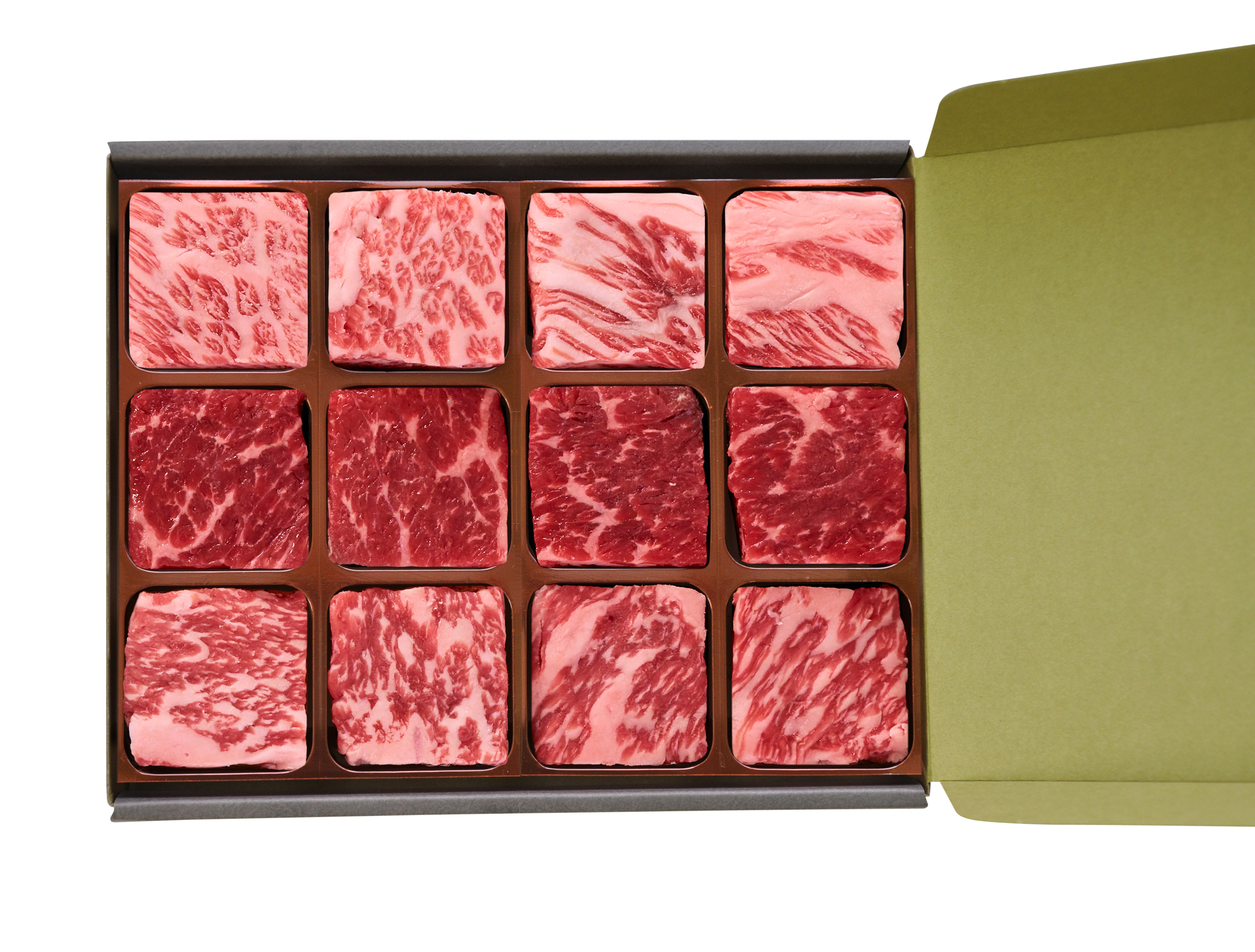 3cm×3cmの正方形ステーキが全12個(各県4個ずつ)入ったセットです。