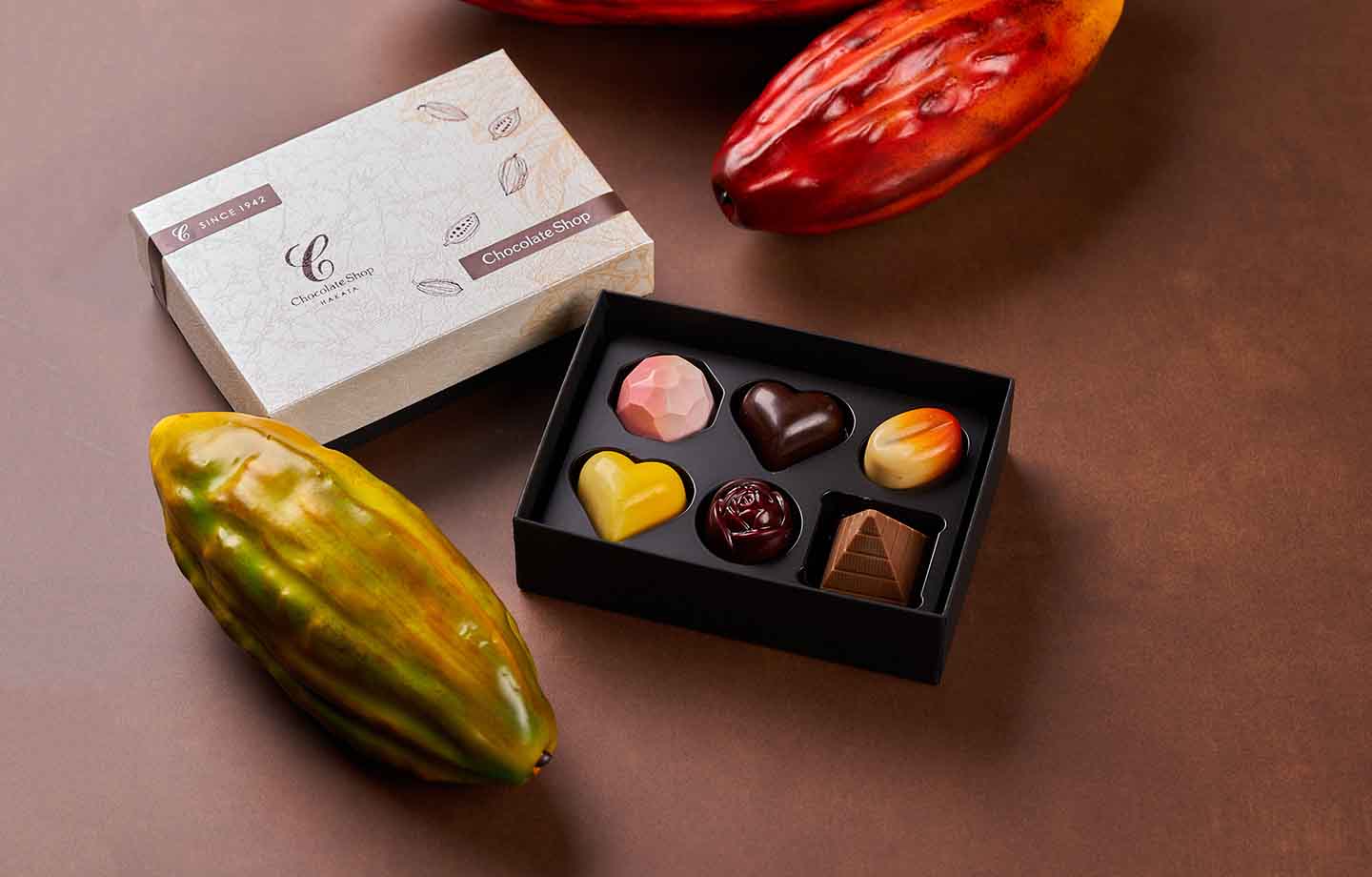 1942年の創業以来続くチョコレートショップの製法と哲学を、ひと粒ひと粒に込めました。ひと箱でいろいろな味わいを楽しめる、バラエティセットです。