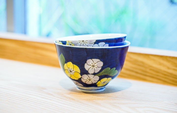 藍色に塗りつぶした『濃(だみ)』の中に花の絵がとてもかわいく描かれた夫婦茶碗です。
