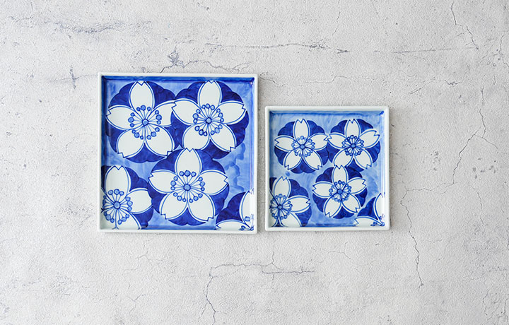 有田焼 伯父山窯 染付桜紋 18cm角皿と14cm角皿の2枚セット (有田焼 八右衛門窯 大慶)