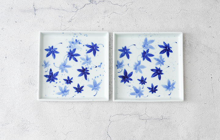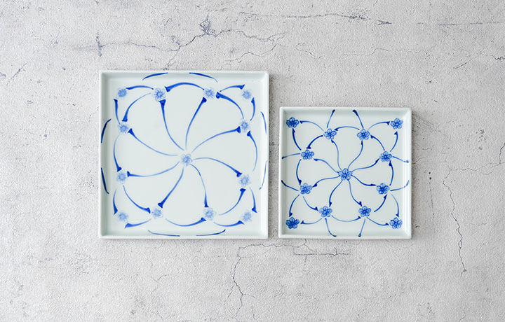 有田焼 伯父山窯 染付ひねり梅小紋 18cm角皿と14cm角皿の2枚セット (有田焼 八右衛門窯 大慶)