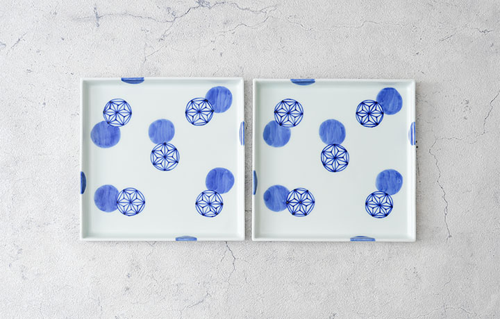 有田焼 伯父山窯 染付麻紋18cm角皿の2枚セット(有田焼 八右衛門窯 大慶)