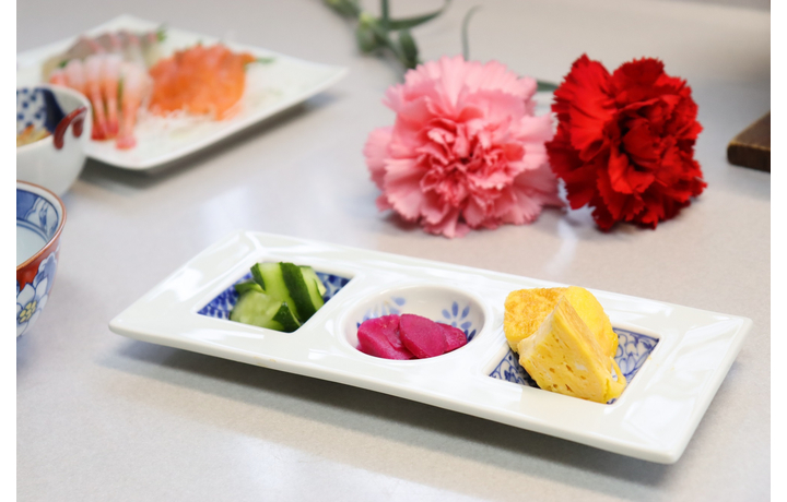 お漬物の盛り付け、三種のタレ、和菓子を盛り付けお茶と一緒に、と使いやすい器です。