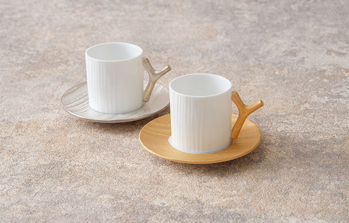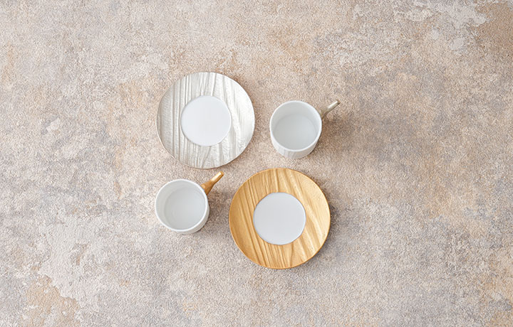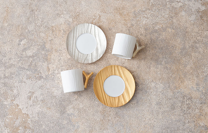 天然の木目を写し取った木目シリーズのデミタスカップとソーサーです。デミタスカップとは、コーヒーカップの半分ほどの大きさのカップを指します。取っ手とソーサーに金、銀を施しています。