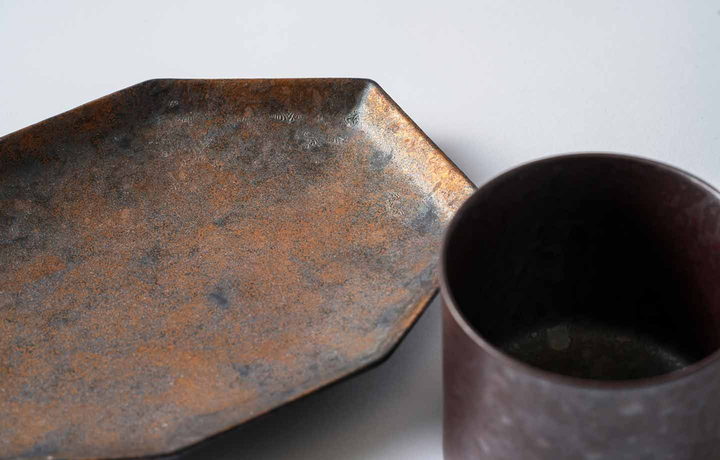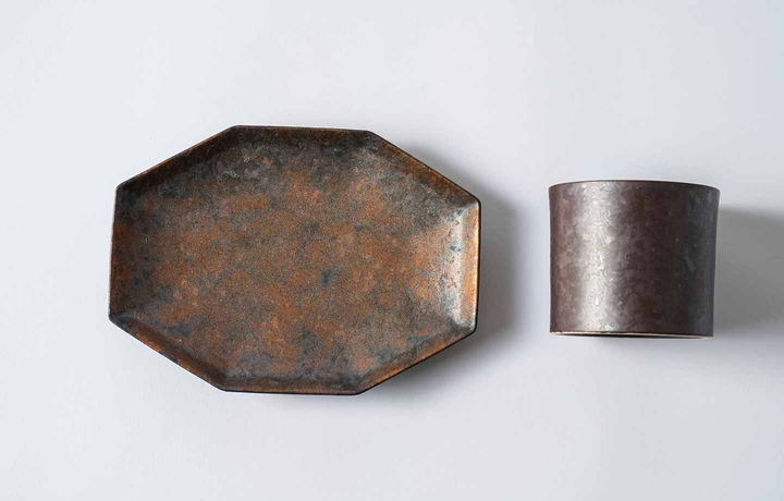 ・19.5cm長八角皿(黒サビ絞り銅散) 電子レンジ不可