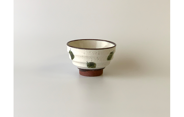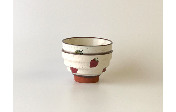 赤土に白化粧をほどこし、独特な色合いの釉薬で手描きの苺が散りばめられています。