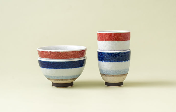 【波佐見焼 ニットボーダー 茶碗&湯呑(BL・RD)4点セット】