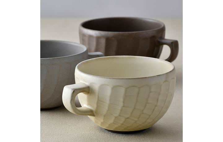 窯元独自で調合された釉薬により、あたたかみのある風合い、上品な雰囲気に作り出されたスープマグ。