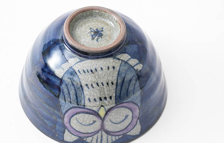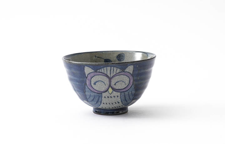 濃(だみ)の中にフクロウが描かれた茶碗です。