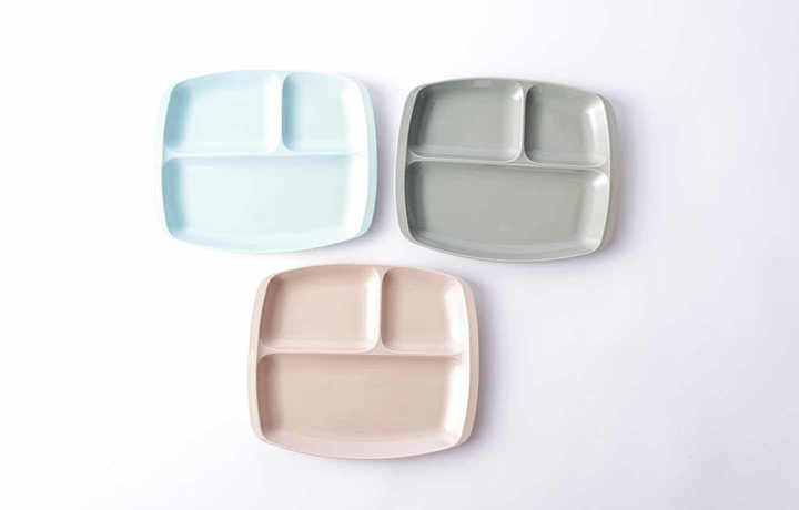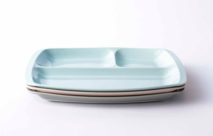 柔らかなカラーのシンプルでおしゃれなランチプレート。フラットの面積が広く、盛り付けもしやすいのが特徴です。 重なりもよく、収納も場所をとらず◎
