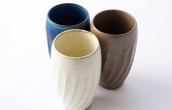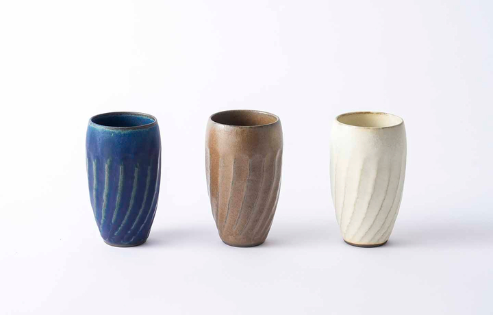 窯元独自で調合された釉薬により、あたたかみのある風合い、上品な雰囲気に作り出されたフリーコップ。手仕事の温もりを感じるおしゃれな『ねじり鎬』は、和・洋どちらの食卓にも映えるデザインです。朝食・ランチ・夕食と、シーンに合わせて多彩なコーディネートを楽しむことができます。カラーバリエーション(ブルー・ブラウン・ホワイト)