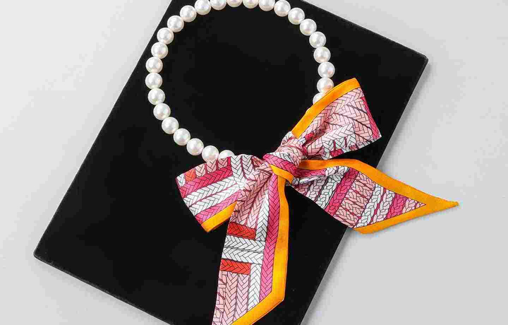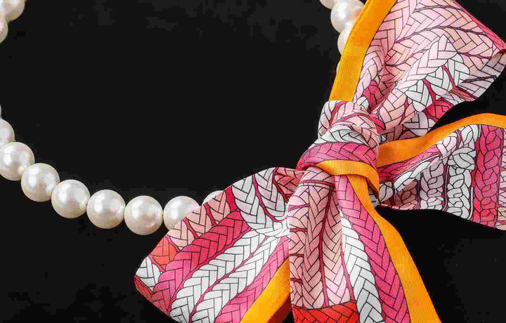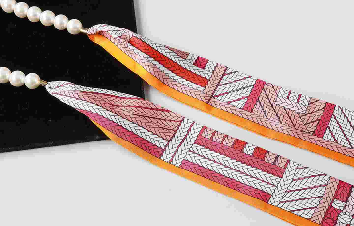パールに細いスカーフが付いてます。季節を問わないパールスカーフは身につけてると毎日の気分が上がるオススメのアイテムです。