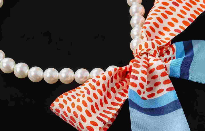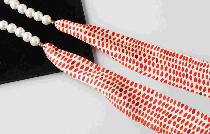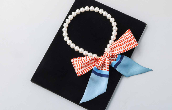 パールに細いスカーフが付いてます。季節を問わないパールスカーフは身につけてると毎日の気分が上がるオススメのアイテムです。
