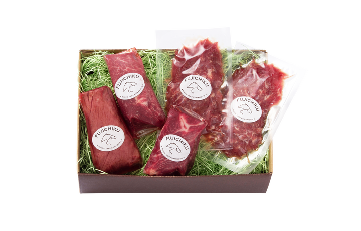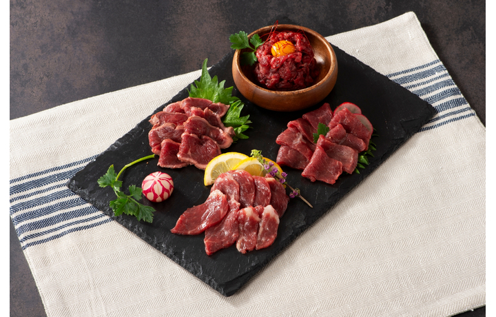 馬刺しの本場・熊本の自社牧場育ち、自社加工の新鮮なお肉をお届けいたします。熊本特産の馬刺しの醍醐味である「霜降り」馬刺し。中でも、一頭からわずかしか取れずきめ細かく入ったサシが特徴の最高級部位メン(三枚バラ)は口の中に入れた瞬間、馬肉ならではの甘みのあるサシが溶け出し、豊かな甘みが口いっぱいに広がります。さらに大トロ、中トロと霜降り馬刺しを堪能いただけます。たたきは旨みを閉じ込めあっさりとした味わいをお楽しみいただけます。ランプは部位特有の旨みがあり、なおかつランプならではの香りをお楽しみいただけます。もっともポピュラーな赤身肉はモチっとした食感と馬肉本来の旨みを堪能いただけます。さらに今では貴重となったユッケは馬刺し用の新鮮な馬肉を100%使用。自社独自の配合で丁寧に細切りに仕上げました。