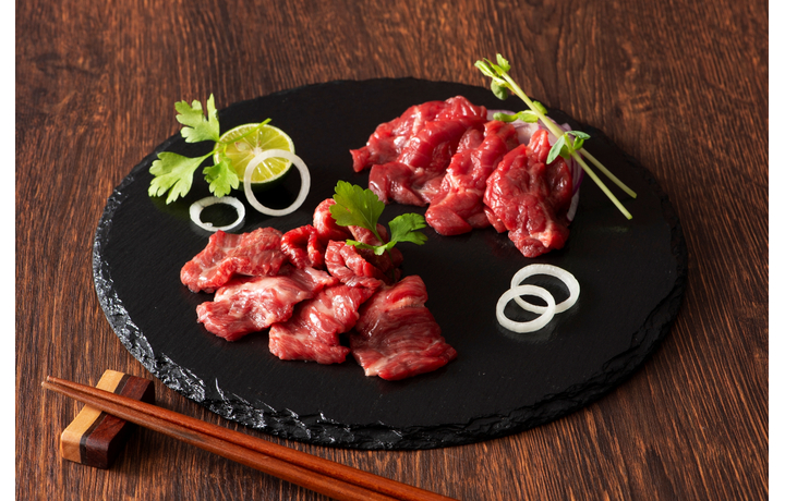馬刺しの本場・熊本の自社牧場育ち、自社加工の新鮮なお肉をお届けいたします。熊本特産の馬刺しの醍醐味である「霜降り」馬刺し。中でも、一頭からわずかしか取れずきめ細かく入ったサシが特徴の最高級部位メン(三枚バラ)は口の中に入れた瞬間、馬肉ならではの甘みのあるサシが溶け出し、豊かな甘みが口いっぱいに広がります。たたきは旨みを閉じ込めあっさりとした味わいをお楽しみいただけます。また、定番にして、一番人気上赤身はモチっとしながら歯切れの良い食感が特徴です。赤身ならではの馬肉本来の旨みを堪能いただけます。そして、今では貴重となったユッケは馬刺し用の新鮮な馬肉を100%使用。自社独自の配合で丁寧に細切りに仕上げました。
