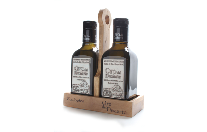 250mlサイズの2つのテイスト(「アルベキーナ」と「ピクアル」)と、オリーブの老木で作られた専用のトレーが一緒になったセットです。