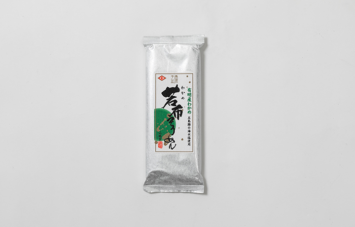 良質な有明海の若布の粉末を練り込んで、完全熟成しながら延ばした手延べ素麺。着色料を全く使用していません。弾力感のあるめんと若布の風味、そしてきれいなエメラルドグリーンの鮮やかな色が特徴です。