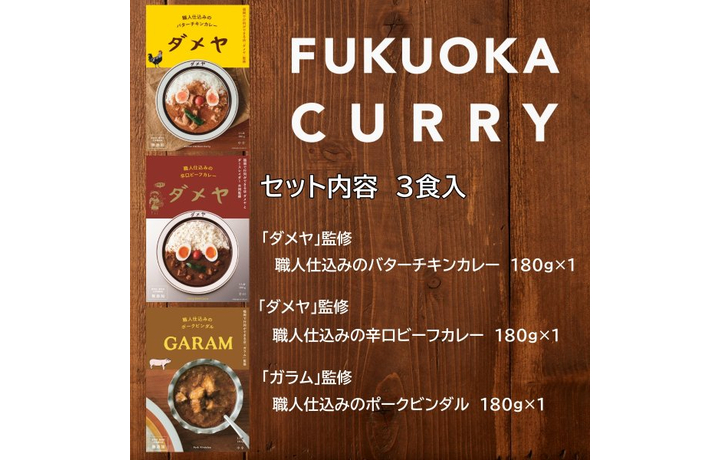 ・ダメヤ監修 職人仕込みのバターチキンカレー《原材料》鶏肉(国産)、鶏出汁、トマト、サラダ油、バター、ヨーグルト、カシューナッツ、生クリーム、にんにく、しょうが、はちみつ、香辛料、レモン果汁、砂糖、塩、鰹節、(一部に鶏肉・乳成分・カシューナッツ・大豆を含む《内容量》 180g《賞味期限》720日《JANコード》4560325588011・ダメヤ監修 職人仕込みの辛口ビーフカレー《原材料》牛肉(オーストラリア産)、鶏出汁、玉葱、サラダ油、りんご、人参、トマト、赤ワイン、にんにく、しょうが、塩、香辛料、柿、レーズン、醤油、オイスターソース、ウスターソース、鰹粉(一部に牛肉・鶏肉・りんご・大豆・小麦を含む)《内容量》 180g《賞味期限》720日《JANコード》4560325588035・ガラム監修 職人仕込みポークビンダル《原材料》豚肉(デンマーク産)、ソテーオニオン、菜種油、トマトピューレ、リンゴ酢、おろしにんにく、おろししょうが、香辛料、きび砂糖、塩、(一部に豚肉・りんごを含む)《内容量》 180g《賞味期限》720日《JANコード》4560325588028