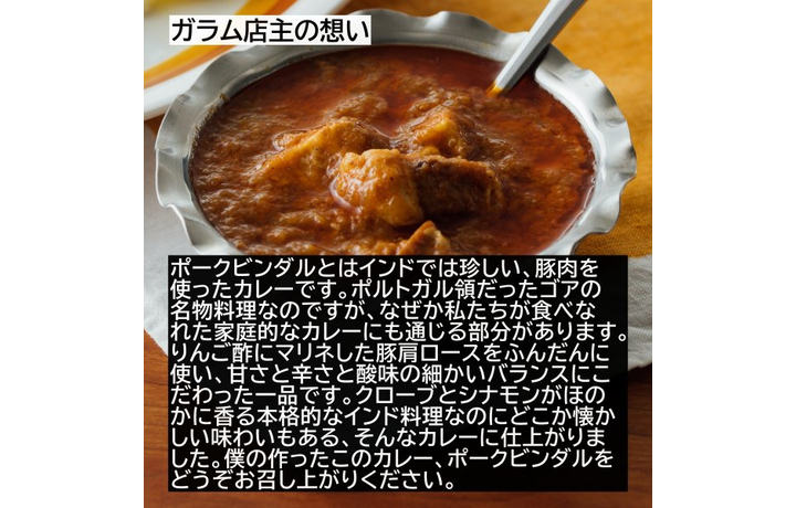 ポークビンダルーは以前、店で不定期に出していたメニューでした。特にこのレシピは手間がかかることもあり、現在、店舗営業では出していない状況です。しかし、定期的に、お客さんから「食べたい」という要望を受けていました。ちょうどカレーレトルトのお話をキヨトクの渡邊さんから頂いた時みなさんに食べて頂くなら、このポークビンダルーでできないか、と考えました。材料のバランスを取るのが難しく何度も試作を繰り返しました。最終的には、ガラムらしさが出た仕上がりとなりました。甘・辛・酸のバランスやスパイス感もうまく出せたので、店のファンの方も納得していただけるポークビンダルーになったと思います。御自宅でぜひ、GARAMの味を楽しんでください。