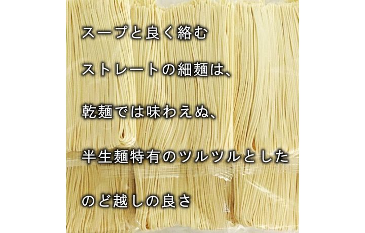 ・スープと良く絡むストレートの細麺は、乾麺では味わえぬ、半生麺特有のツルツルとしたのど越しの良さがお楽しみいただけます。