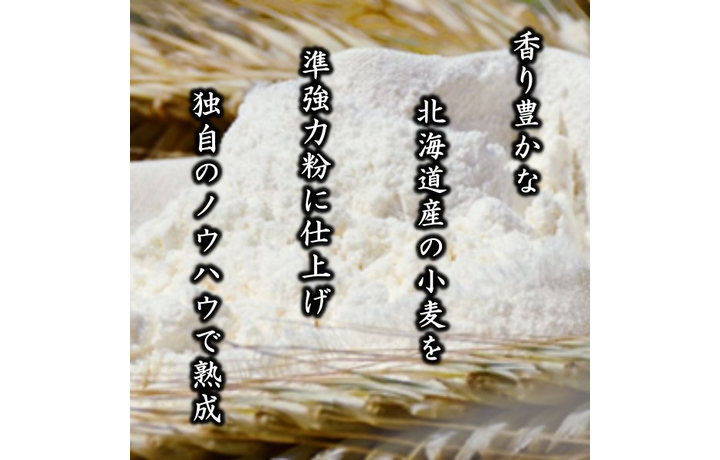 ・香り豊かな北海道産の小麦を、準強力粉に仕上げ、独自のノウハウで熟成させることによりツルツル感とモッチリ感の絶妙なバランスを実現しました。