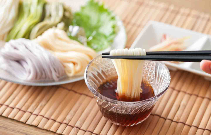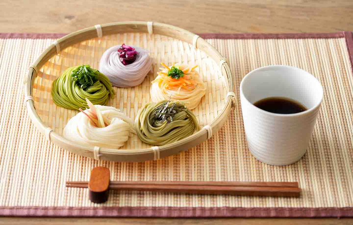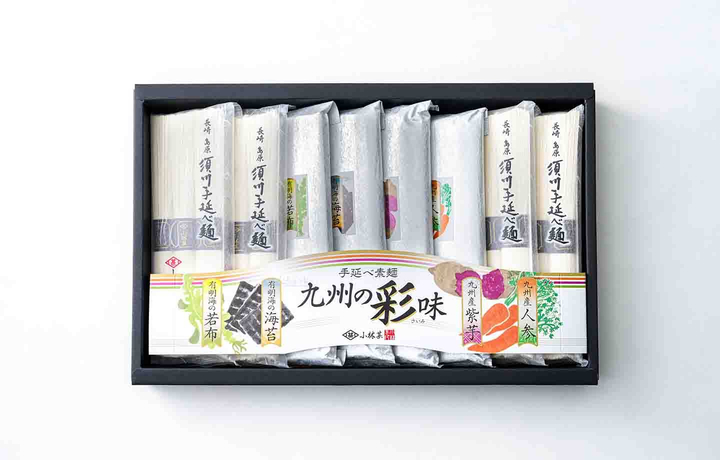 国内産小麦粉使用の手延べ素麺と、九州産の人参・紫芋、有明海の海苔・若布をそれぞれ練りこんだ彩り豊かな手延べ素麺の詰合せ。