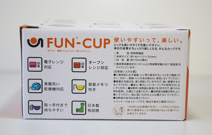 ・ファンカップ(野いちご、樹の森、幸せ四つ葉):直径11.5cm×14.5cm×高さ7cm 重さ190g 容量(満水時)370ml メモリ100~250ml対応