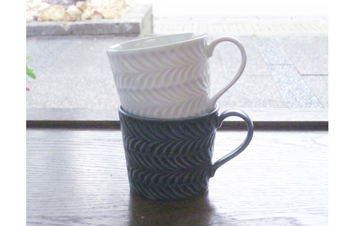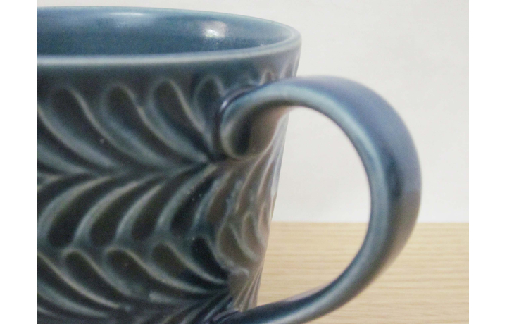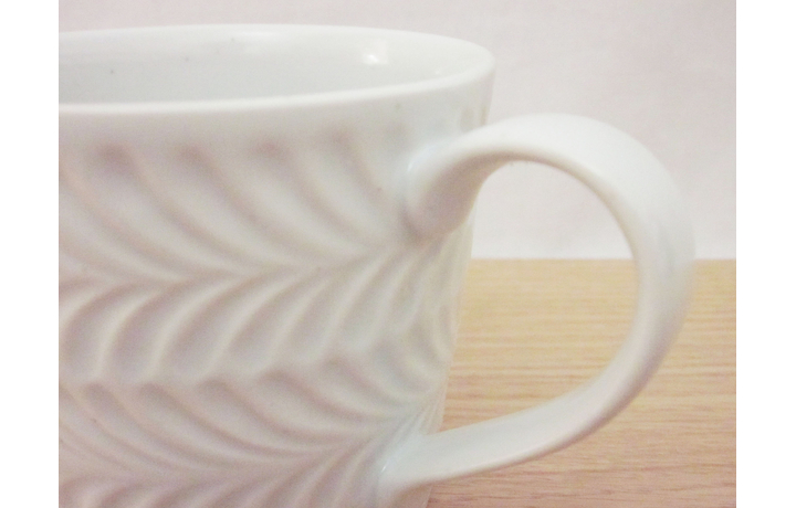 ローズマリーをイメージした彫りがマグカップ全体に施されています。