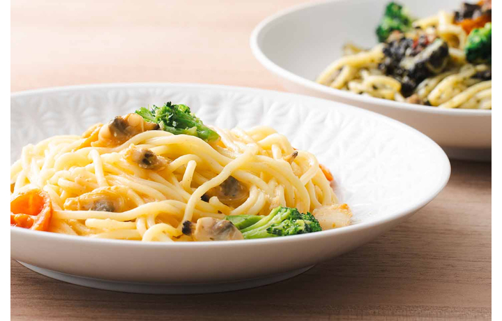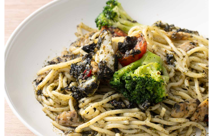 めん〔フェットチーネ(デュラム小麦粉、食塩)(国内製造)〕、野菜(ブロッコリー、トマト)、魚肉(いか、あさり)、植物油脂、刻みにんにく、昆布茶、焼き海苔粉末、食塩、唐辛子、(一部に小麦・いかを含む)