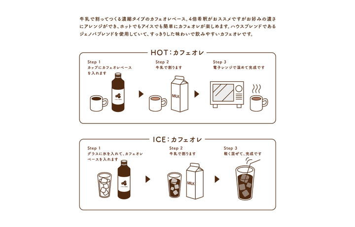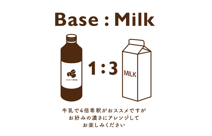 カフェオレベース1:牛乳3の割合がおすすめですが、お好みに合わせて濃さを調整いただけます。