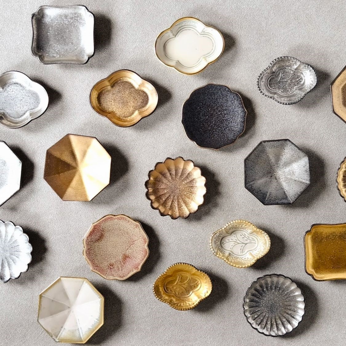 金銀の重厚感はそのままに、小ぶりで可愛いミニ陶箱は存在感も抜群。 渕付の小皿は陶箱の蓋にもなり、組み合わせて蓋物としてもお使いになれます。 ミニ小皿は、箸置きやレスト、コースターなどに使えるサイズ展開となっています。